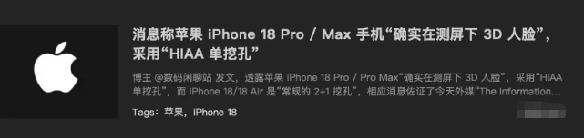 另外,iPhone18标准版的背面影像模组终于跟上脚步,镜头升级为矩形对角。而iPhone18Pro/18ProMax则是和iPhone17Pro保持一致,不过机身整体会变厚一点,18ProMax也会增重到243g。换句话说,iPhone18ProMax会比现在最重的14ProMax(240g),更加放飞自我。