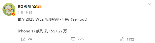 据博主@RD观测 爆料:“截至2025 W52 旗舰销量-苹果(Sell out)iPhone 17系列 约1557.27万”。