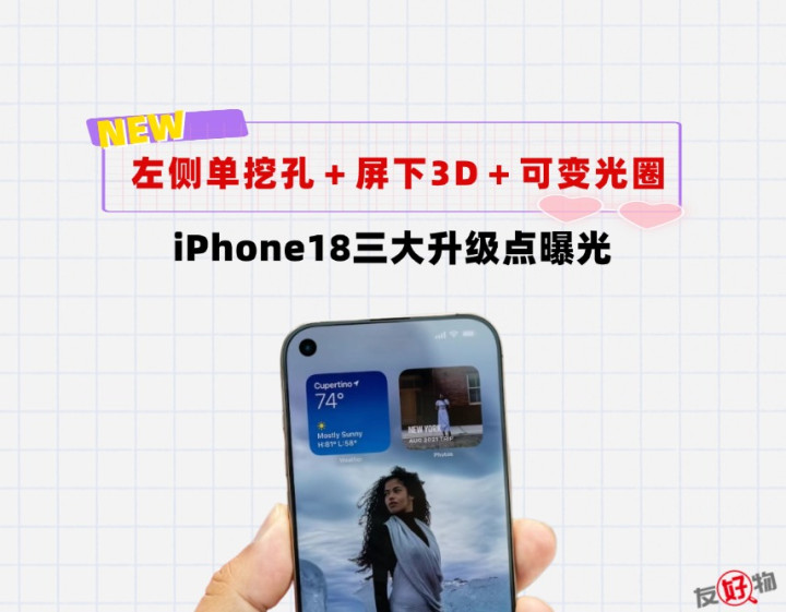 据外媒The Information爆料,iPhone18Pro/18ProMax将迎来外观大改。摒弃引用4代的灵动岛挖孔,改为左上角单挖孔前置镜头。搭配屏下FaceID技术,目的就是让果粉既能享受到前置的高清自拍,又能感受到全面屏的极致魅力。就是不知道加大难度的自适应屏幕,大家能不能顶得住。