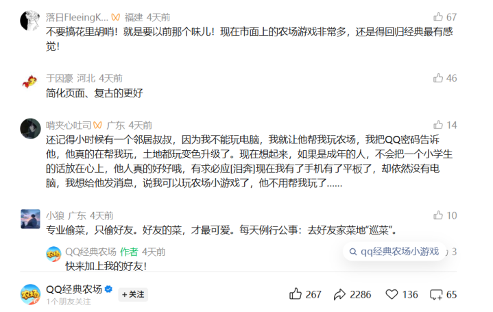 在《QQ经典农场》官方官宣文章的评论下面,点赞最高的两个评论是回归经典,不要花里胡哨。
