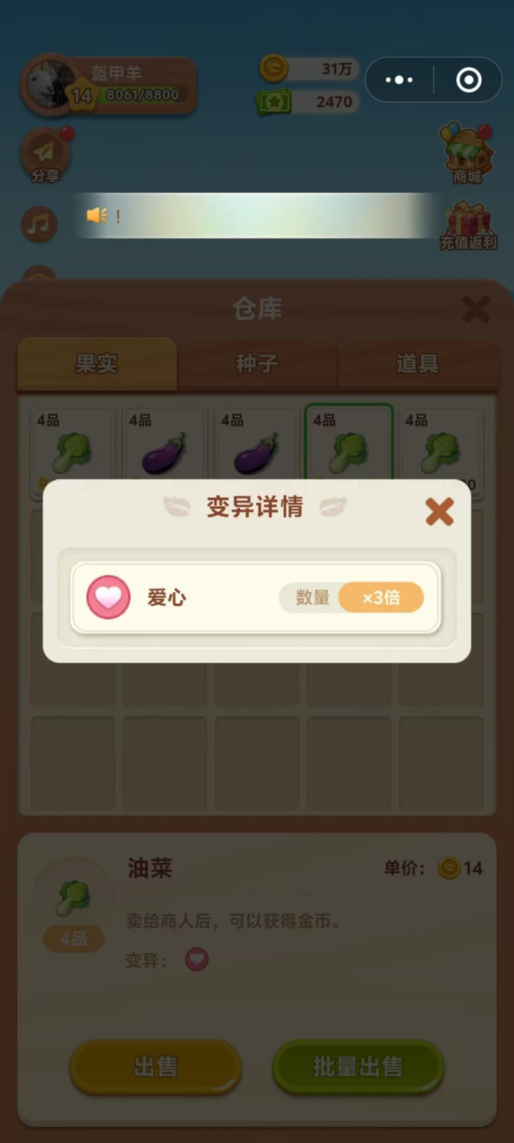 此外,《QQ经典农场》新加入了变异的玩法,种出的菜可能会随机产生变异,售价也会提升好几倍。