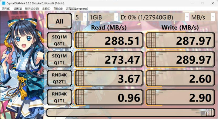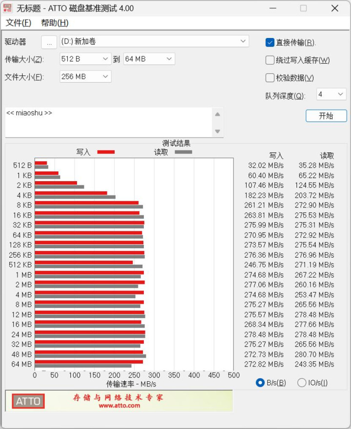 ATTO同样是常用的磁盘测试工具。从测试结果来看,当传输文件大小达到32KB时,读写速度会基本稳定在270MB/s区间内,随着文件增大只有小幅波动,最终成绩稳定在275-280MB/s之间。