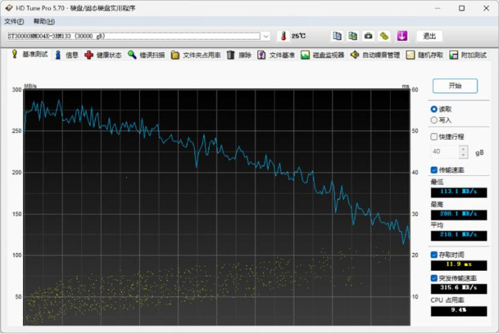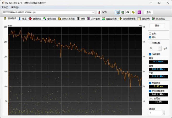 HD Tune基准测试最高读取速度288.1MB/s,这也是外圈读取速度,而在内圈时,最低读取速度也有113.1MB/s,访问延迟平均11.9ms。写入最大速度为289.8MB/s,性能表现不错。整体的读写成绩也与上面CrystalDiskMark吻合,表现稳定。