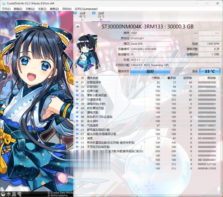 首先登场的是CrystalDiskInfo信息检测,这里我们可以看到非常详细的硬盘信息,包括容量、接口标准、转速、温度等信息,各项健康指标均显示良好,通电时间甚至只有1小时,可谓是从生产线直接送到了实验室。