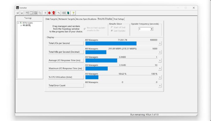 最后我们使用专业的IOmeter对硬盘进行测试,它可以模拟不同条件下的I/O操作,灵活性更高。这里我们选择了从4KiB、16KiB、32KiB一直到256KiB等多个文件测试脚本,结果希捷30TB银河系列硬盘的平均成绩在275-280MB/s之间波动,与上述其他软件测试结果一致。