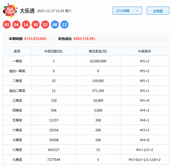 大乐透第2025148期开出奖号为:03、04、14、30、32+08、12。其中前区奇偶比为1:4,三区比为2:1:2,大小比为2:3,后区开出全偶组合。
