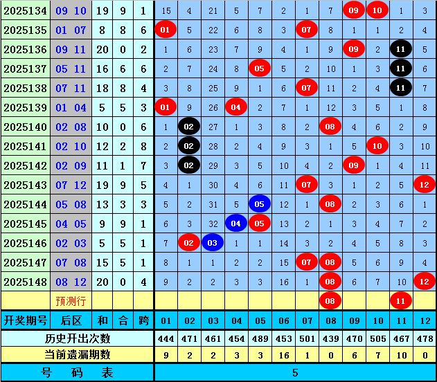 后区五码推荐:01、07、08、09、11